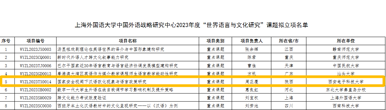 (通讯员:闫俊晓)近日,国家语委科研基地暨国家语言文字智库中国外语战略研究中心对2023年度“世界语言与文化研究”课题立项名单予以公示,共有136项课题获得立项,包括重点课题25项,一般课题63项和青年课题48项。英国365集团公司周正履老师主持申报的项目“国家安全视阈下汉语欧化现象与语言政策研究”获批重点立项,主要参与人包括陈坚林教授、秦枫教授、陈韵博士和闫俊晓、白雪两名研究生。