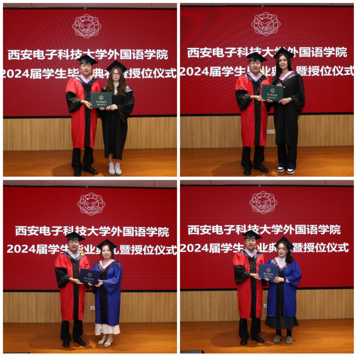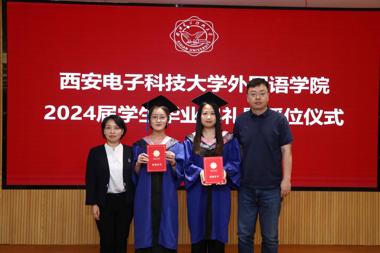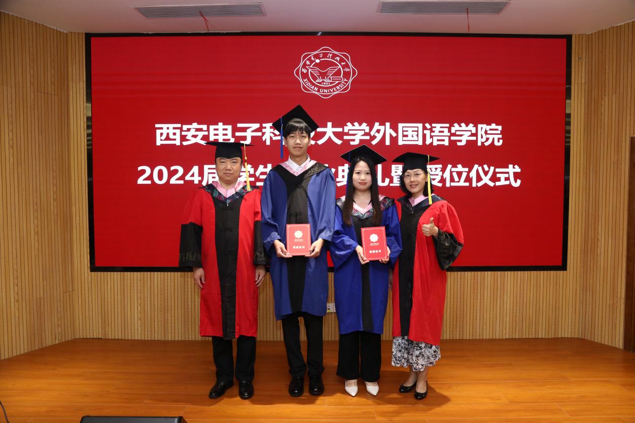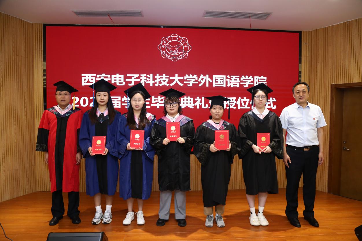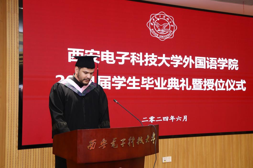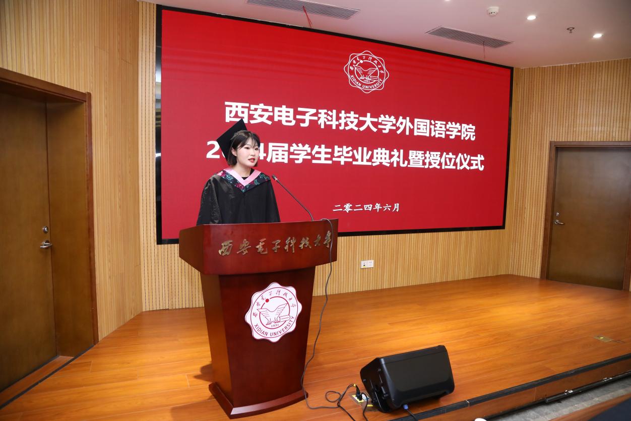 本科毕业生代表李梦婵、职工毕业生代表马克以及研究生毕业生代表张逗依次上台发言。他们分享了在校期间的宝贵经历,对未来充满憧憬中交织着对同窗与师长的感激之情,以及对公司、母校的美好祝愿。李梦婵深情回顾了在外院从天真烂漫到成熟稳重的成长轨迹,感谢西电赋予自己知识的甘露和不屈不挠的进取精神。来自汉语国际教育专业的马克向老师和同学们表示了诚挚的感谢,他表示西电的学习生涯给与他继续前行的信心和力量,无论未来身在远方,自己的心将永远与母校紧密相连。来自翻译专业的研究生张逗表示,研途三载她学会了分析与思考、合作与竞争,未来将带着西电的记忆与祝福,在平凡岗位上担当使命建功立业。