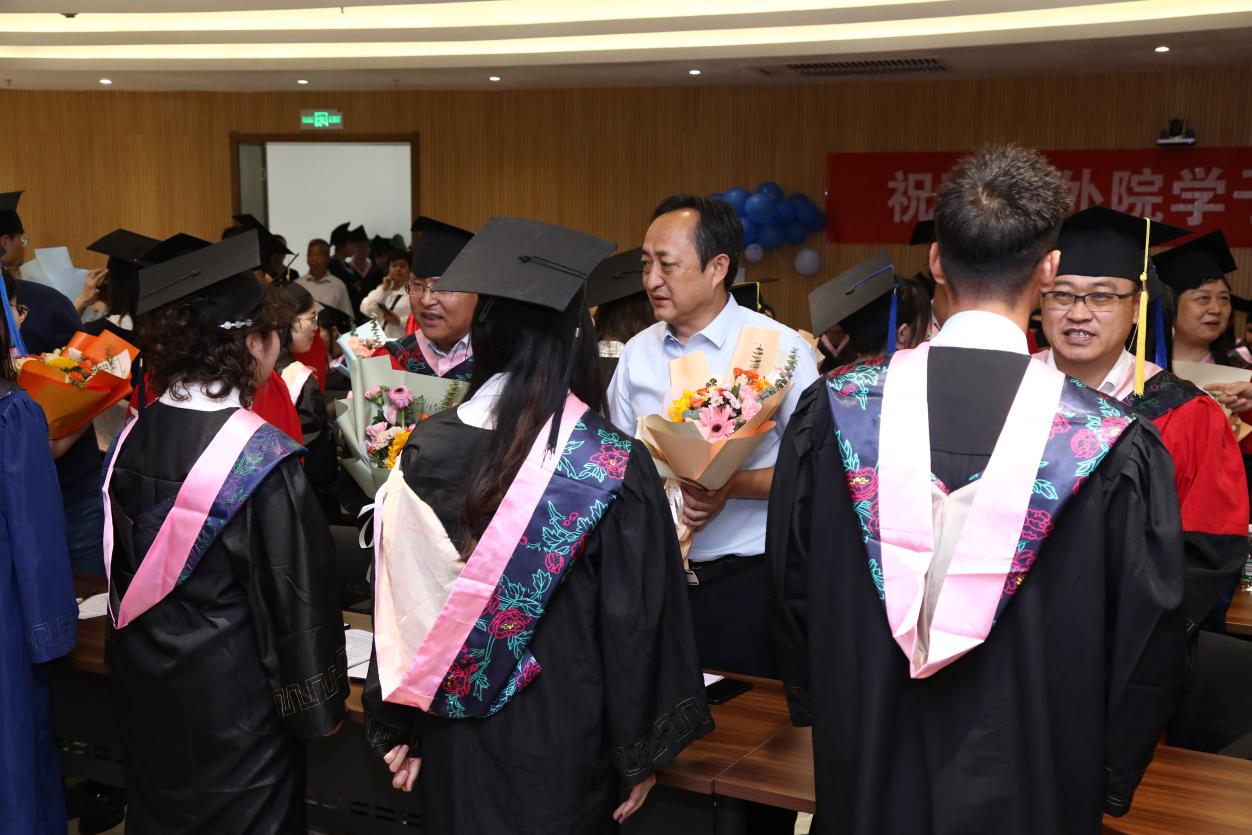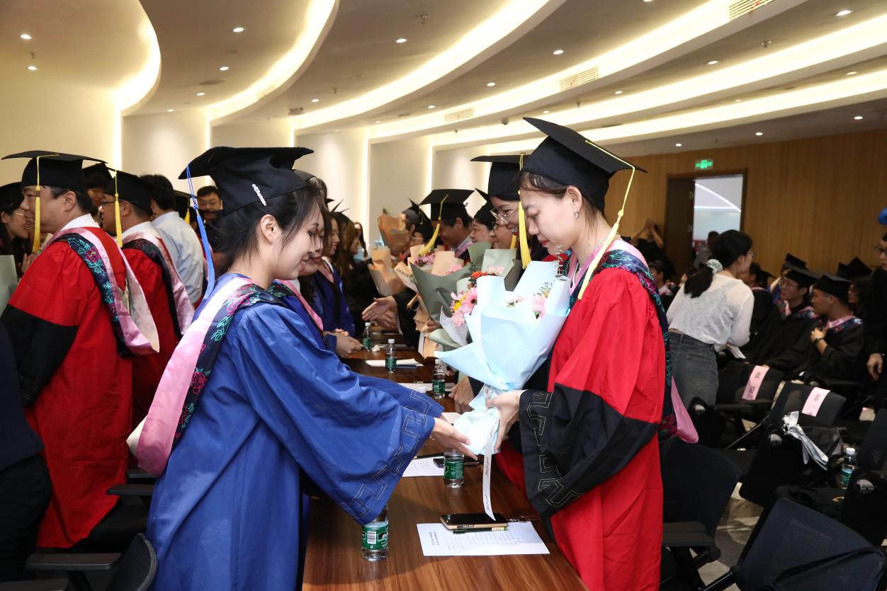 在授位环节,李长安宣读了授位决定文件。伴随着欢快的音乐,毕业生们排着整齐的队伍依次上台,执行经理马刚一一为同学们拨穗,并颁发学位证书。毕业生们双手接过证书,鞠躬致谢,与经理留下宝贵的合影。