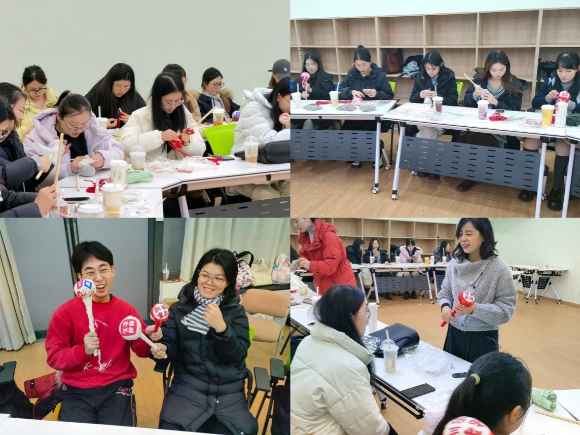 手工环节将活动推向了高潮,现场氛围热烈,杜老师与同学们一起动手制作艾草锤。艾草锤是一种传统的中医养生工具,可以放松肌肉、舒筋活络、促进血液循环。从精心挑选花布、细心包裹艾草,到巧妙缠绕毛绳,每一个步骤同学们都全神贯注,并融入了自己的独特创意。