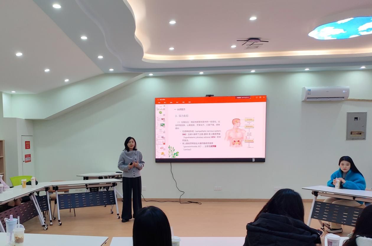活动在杜敏老师深入浅出的讲解中拉开序幕。杜老师凭借扎实的专业知识和丰富的实践经验,系统分析了压力产生的根源、表现形式及其对个体身心健康的深远影响。通过生动的案例分享和直观的数据展示,杜老师帮助同学们认识到心理健康的重要性,以及压力管理在维护身心健康中可以起到的关键作用。