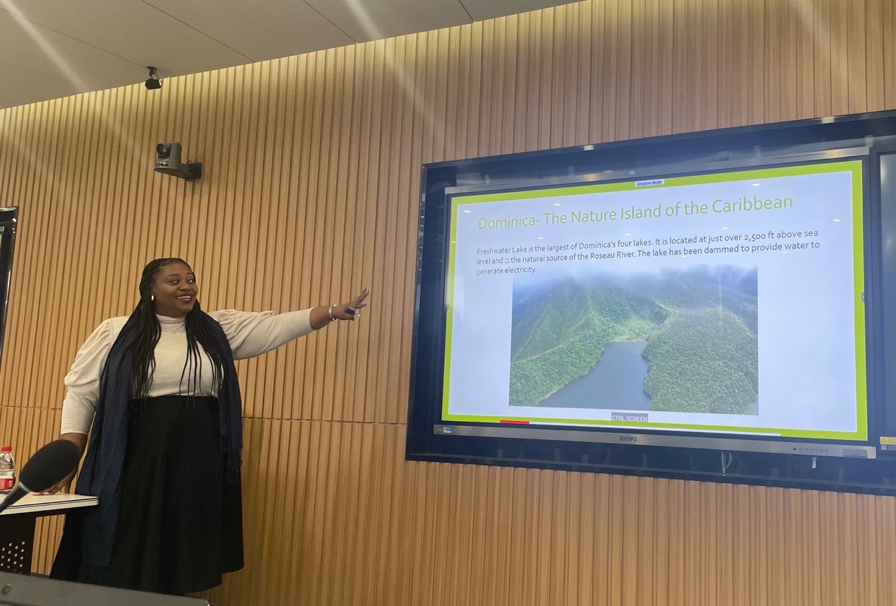 Nadine Riveiere主任首先就多米尼克国的历史、文化特色和经济产业等方面做了生动介绍。多米尼克国位于加勒比海地区,历史悠久,文明悠长,文化灿烂多样。Nadine Riveiere从最初来自亚洲的先祖讲到了多米尼克不同的原住民群体及其文明特征,从1943年哥伦布发现岛屿讲到了英法殖民时代引起的物产交流,从1978独立战争讲到了今天的不同政党执政情况。最后,她特别提到了自新世纪以来多米尼克国已与多个国家建立了良好外交关系,尤其是2004年自中多两国建正式建交以来,两国交往不断关系发展顺利,开展了多方面合作。