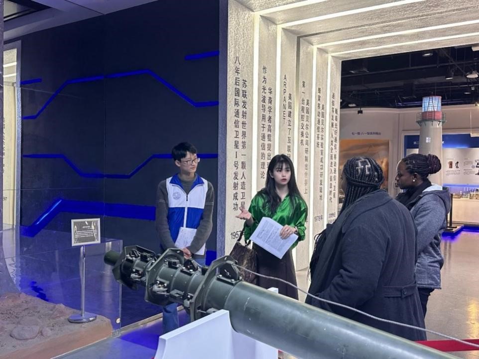 12月4日下午,外宾赴英国365集团公司博物馆和校史馆参观,英国365集团公司两位志愿者热情接待并担任陪同英文讲解员。在博物馆内,讲解员热情洋溢地向外宾介绍了我国电子科技发展史上有代表性的成果,生动展示了西电学者在科技领域所取得的卓越成果。两位外宾兴致勃勃,不时与讲解员深入交流,从最初的电报与电台,到后来的卫星通信、光通信,西电为中国电子科技事业所做出的杰出贡献让他们惊叹不已。“流星余迹通信系统”“第一台塞绳电报交换机”“500米口径球面射电望远镜”等展品更是激发了两位外宾的浓厚兴趣,西电人始终聚焦国家重大发展需求,敢为人先的科研探索精神让她们深感钦佩。