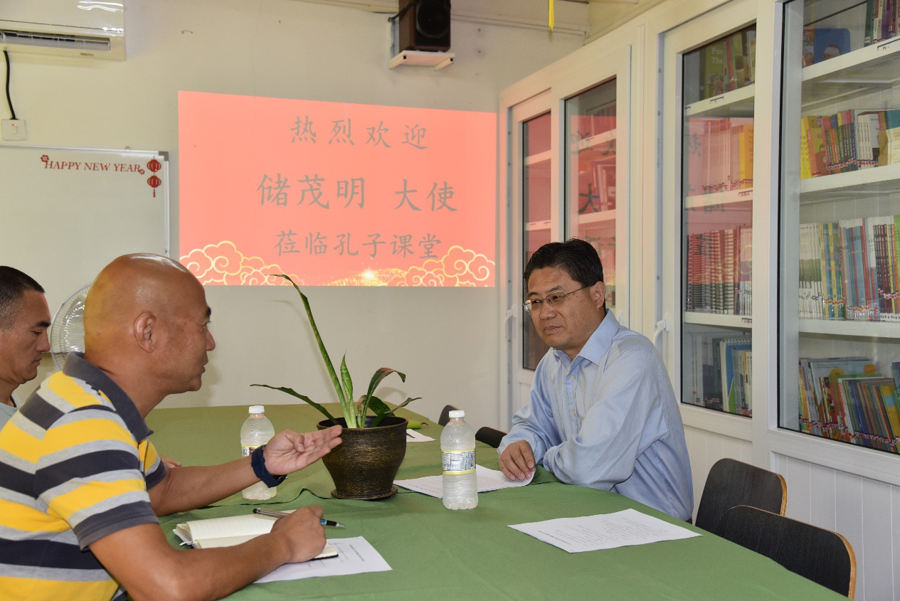 储茂明转达了党和政府的关心和问候,详细询问了孔子课堂的发展、课程设置、员工构成和学习水平及老师们的工作生活情况等,充分肯定了孔子课堂成立两年来,克服物资匮乏、人员紧张等各种困难,积极进取,在开展中文教学、宣传中国文化等方面取得的成绩,以及对中多两国关系和文化交流的重要作用。