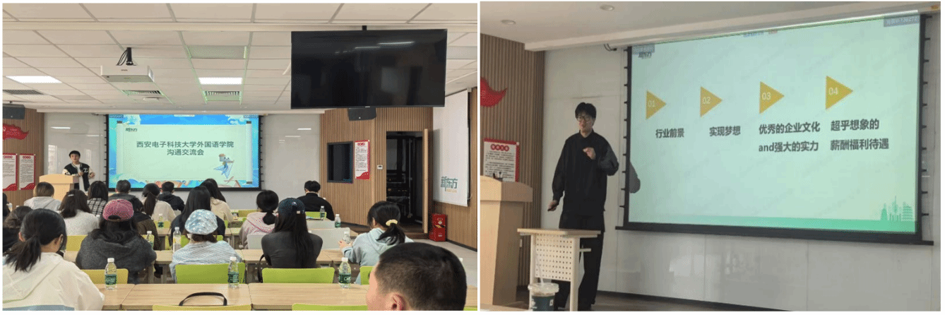 活动期间,新东方人力资源团队向师生们全面介绍了公司的发展历程、企业文化以及当下的人才招聘需求。新东方具有强大的应变能力,成功开辟 “东方甄选” 等新业务赛道,逐步发展成为集教育培训、产品研发、多元服务于一体的大型综合性教育科技集团,公司产品领域对英语专业员工有多元的人才需求。新东方积极求变的发展理念和雄厚的综合实力,得到了师生们的高度认可。