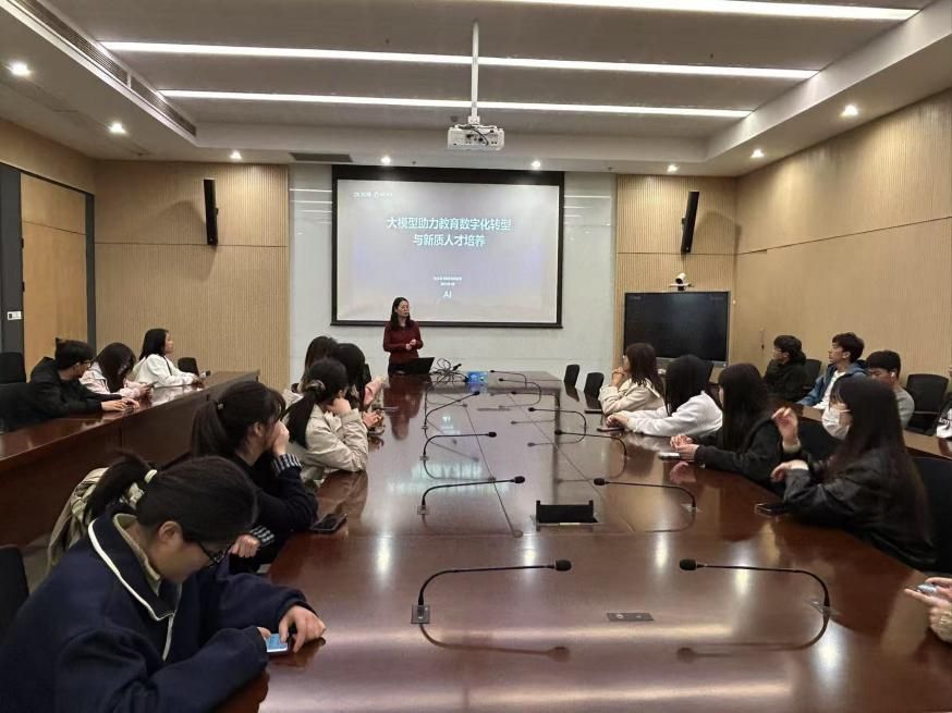 同时,《大模型助力教育数字化转型与新质人才培养》的讲座面向员工展开。讲师深入探讨了大模型技术对行业的影响与发展趋势。同学们踊跃发言,围绕外语专业在科大讯飞的岗位设置、学历要求等积极提问。科大讯飞人力资源负责人表示,外语专业员工需要参与语料构建、翻译和标注等工作,她鼓励外院学子提升综合素养,培养适应时代发展的复合能力。