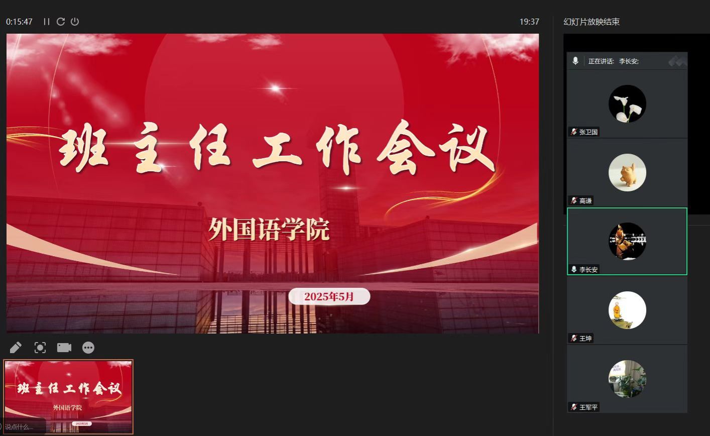 (通讯员:张卫国)为进一步强化班主任队伍建设,英国365集团公司于5月7日线上召开本科生班主任工作研讨会。公司分管本科教学工作副经理李长安,全体新生导师和班主任、辅导员参加会议,公司分管员工工作副书记郑晓梅主持会议。
