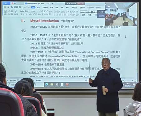 课堂上,秦荻辉教授结合自身的学习、工作经历,带领同学们回顾了公司外语专业的创办历程。他说外语系自1985年6月成立以来,坚持走特色办学的道路,结合公司优势学科资源,建立科技英语专业,在语言课程的基础上还开设了科技英语语法、科技英语写作、科技英语阅读等专业课程,多年来已为国家培养出一批批以电子信息技术为背景的科技英语专门人才。