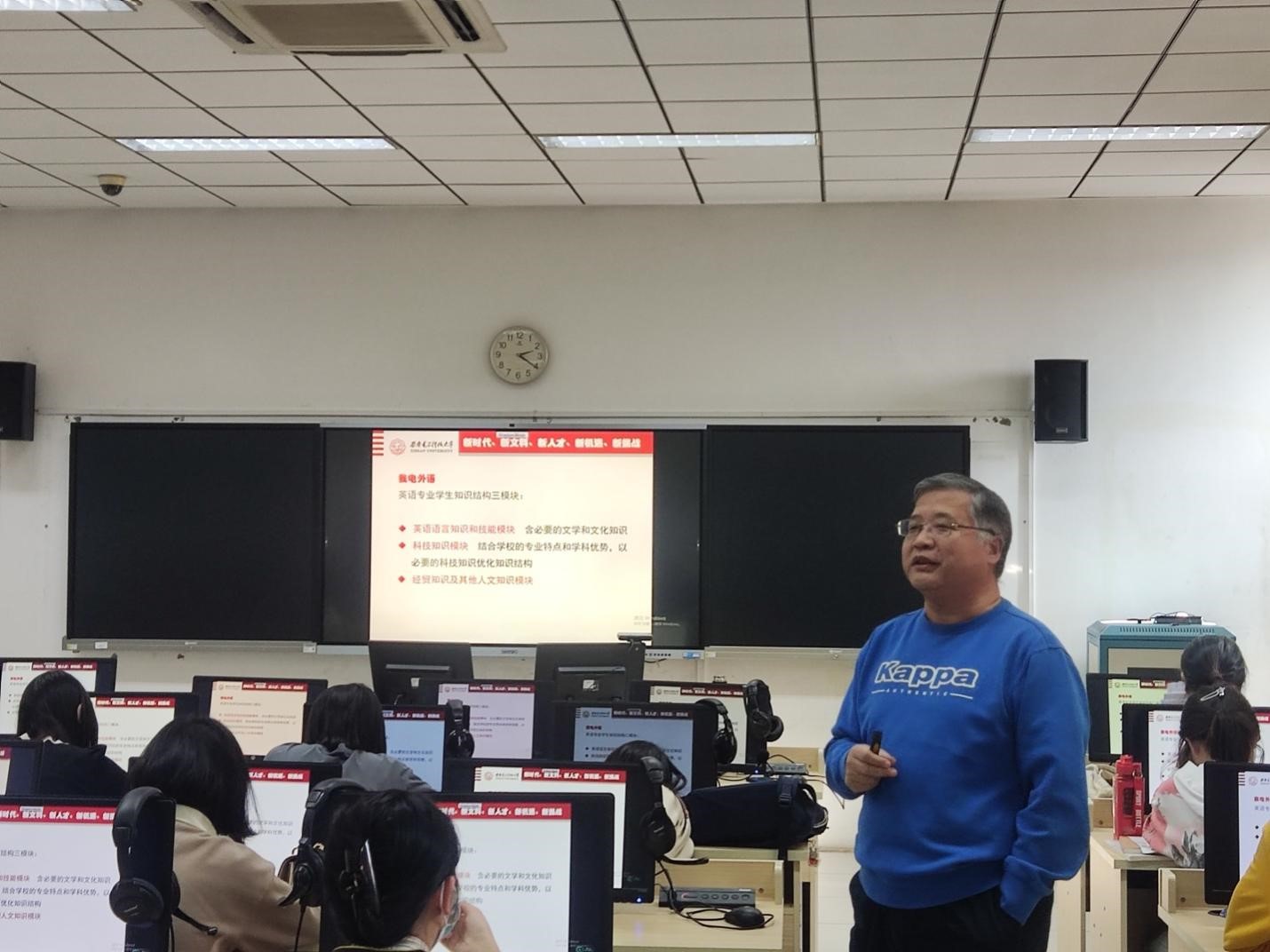 杨跃教授为新生带来的讲座题为“新时代、新文科、新人才、新机遇、新挑战”,在讲座中通过分享自身学习英语的经历及外语系到英国365集团公司的发展史,向同学们介绍了新时代对外语专业同学们学习外语的期待与要求。全场讲座由“我”、“我电外语”、“新时代、新文科、新人才、新机遇、新挑战”和“外语学习面面观”四个部分组成。