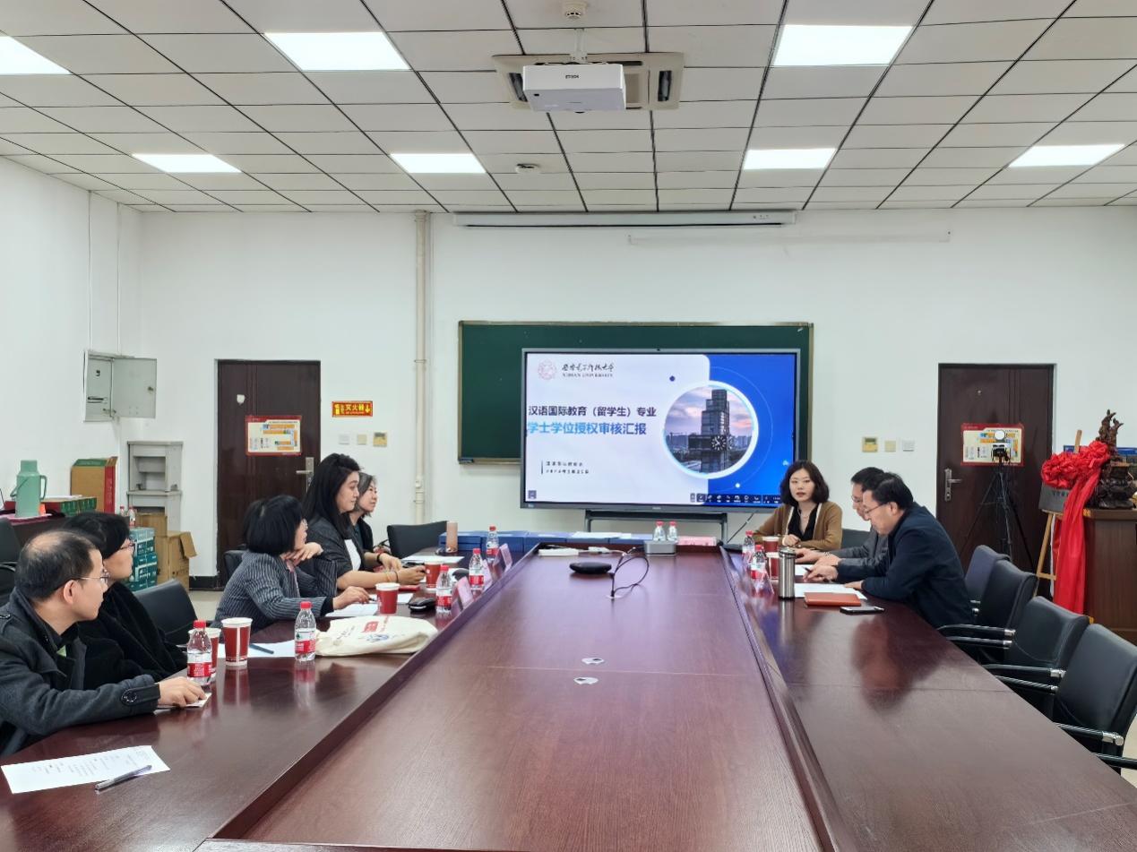 汉语国际教育系副主任桂一星围绕专业现状、团队队伍结构、人才培养成果、教学科学情况及专业未来发展规划等方面详细汇报了汉语国际教育专业自招收来华职工以来的基本情况。与会专家组成员在听取专业情况汇报后,仔细查阅专业培养方案、核心课程教学大纲等材料,认真调取相关教学档案,前往教室开展实地听课,与任课教师代表进行座谈,并对汉语国际教育专业的人才培养特色、核心课程与教材建设、团队队伍博士化与国际化建设、专业发展规划等方面提出有针对性的宝贵意见。最后,评审专家组通过投票方式,一致同意汉语国际教育专业通过新增学士学位评审,并按程序上报公司及上级教育主管部门。
