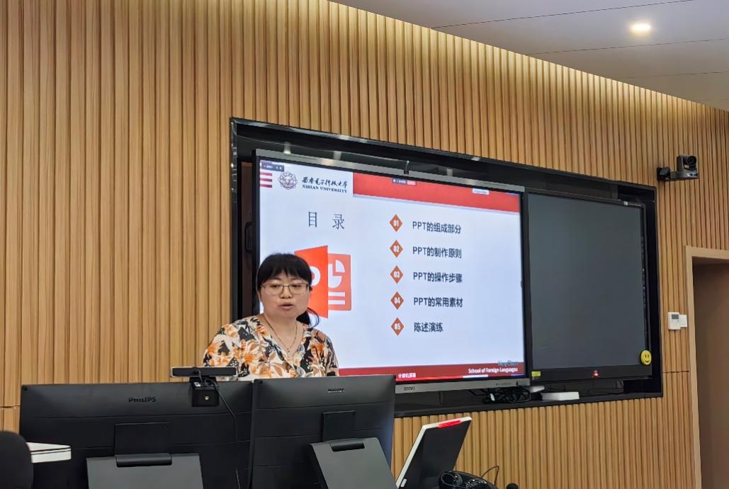 针对外语教学,任静细致讲授了如何更好地把信息技术、智能技术用于辅助教学设计、课件制作和试卷设计,解决教师在实际工作中面临的相关技术挑战和困难。任静强调数字赋能教学全过程,构建混合式教学模式,优化教学方案,建设数智化课程,提高教学质量。教学中在丰富的教学内容、科学的教学方法基础上,还必须制作好课件以便把教学内容更直观、更生动地呈现出来,辅助课堂教学活动的开展。任静逐一介绍了课件的组成部分、制作原则、操作步骤、常用素材、陈述演练等问题。随后,任静指出英语试卷在试题数目、分值、试卷页数、试卷内容编辑方面常出现的问题、正确的做法,务必认真检查试卷编排确保规范。在讲解智能技术应用的同时,任静还现场演示了PPT制作和试卷编辑,现场解答了与会教师在实践中遇到的典型问题,并且展示了她制作的授课课件设计思路和方法。
