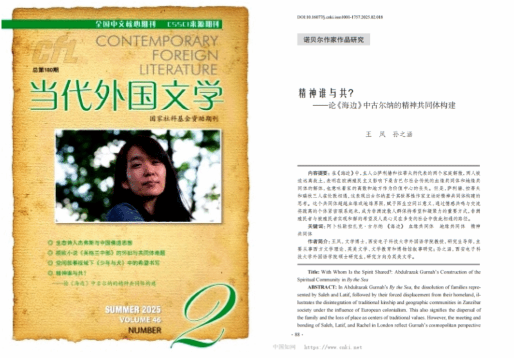 (通讯员:孙之涵)近日,公司王凤教授与指导的2023级硕士研究生孙之涵合作完成的学术论文《精神谁与共?——论〈海边〉中古尔纳的精神共同体构建》在《当代外国文学》2025年第2期正式发表。